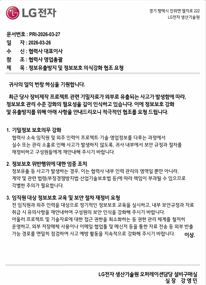 전 직원 분들의 정보 보호 의식 강화 및 정보 유출 방지를 위해 본 게시 글을 작성 합니다. 아래 내용 및 첨부 파일 참고 부탁 드립니다.